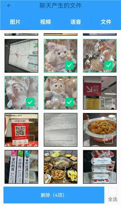 3、勾选需要删掉的图片,视频、语音和文件同理,然后点击下面的【删除】。