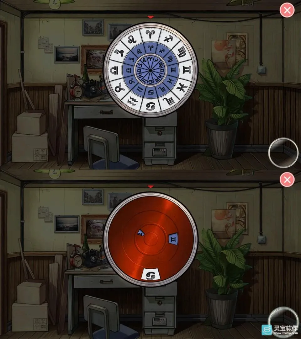 43、向左走两次,调查桌子,圆形盒子上红色箭头下对齐3个白羊标记(3个都在12点方向),然后使用【红色胶片】,可以看到3个星座标记(巨蟹,双子,摩羯),把这3个星座标记对齐红箭头(红色箭头下巨蟹(外圈),然后双子(中间),最后摩羯(内圈)),得到【巨蟹座硬币】