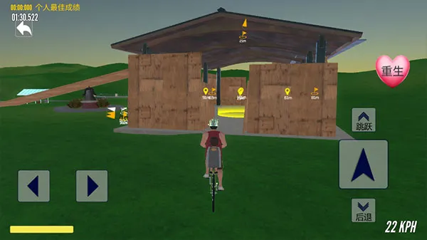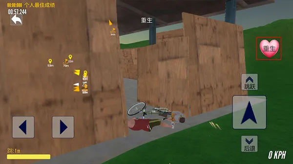 6、玩家需要小心道路的障碍以及四处的暗箭,没有固定的行驶路线,到达目的地即可,受伤摔倒后可通过重生重生开始游戏。